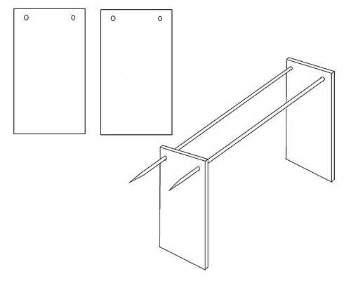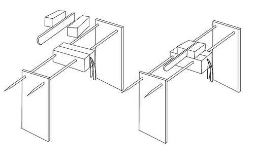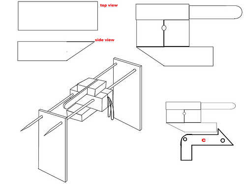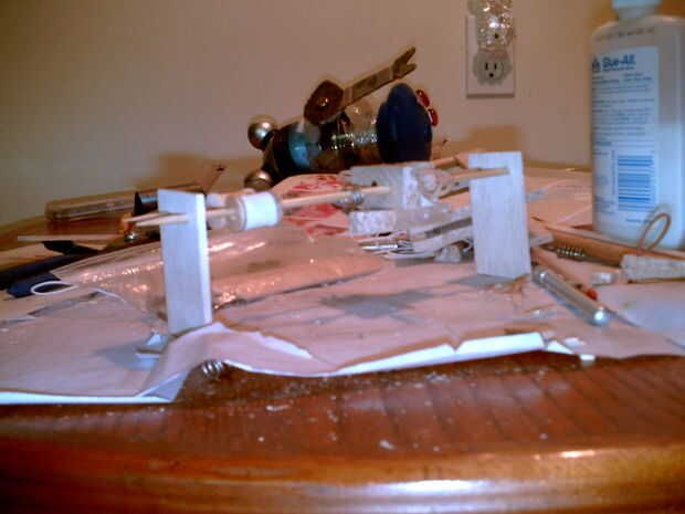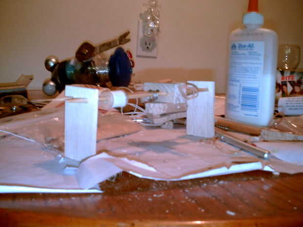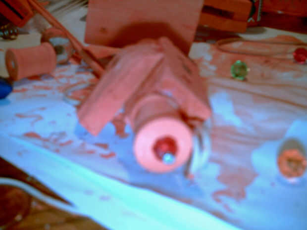 En el lado del mecanismo de deslizamiento, había pegado luego clavó dos carretes de madera pequeña para su uso como algo que agarre para tirar de la corredera hacia atrás. Puesto que la cabeza del clavo era más pequeña que los orificios de la bobina, rosca el clavo a través de un cordón para que la uña Sujete el carrete en la diapositiva. Esto es opcional pero recomendado ya que es difícil encontrar un buen lugar para agarrar el carro para tirar hacia atrás sin las bobinas. Por otra parte, cualquier pieza pequeña de madera podría actuar como un agarre en lugar de los carretes.