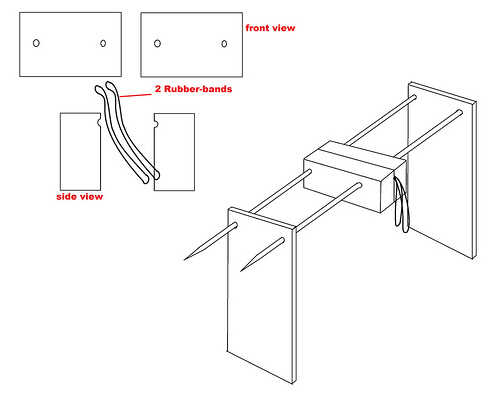 A continuación, la corredera de la pistola sí mismo consisten en varias piezas. En primer lugar, desea hacer la parte que se deslizará a lo largo de la pista y las gomas. Para esto, utilicé dos pequeños pedazos rectangulares de madera y cortar dos agujeros que se alinean perfectamente con los agujeros para los pinchos de bambú. Estas dos piezas se intercala con dos bandas de goma en el centro que se potencia la ballesta. Usé dos bandas de goma para asegurar tenía suficiente tensión para golpear los centavos y como respaldo en caso de una de las roturas de bandas de goma. Debe hacerse una pequeña ranura para que las bandas de goma encajar en tal forma que cuando los bloques se juntan, encajan perfectamente sin espacios. Una brecha podría causar la goma a salir. Eventualmente se pegue y, a continuación, las dos mitades junto con la incertidumbre de dos gomas de uñas.