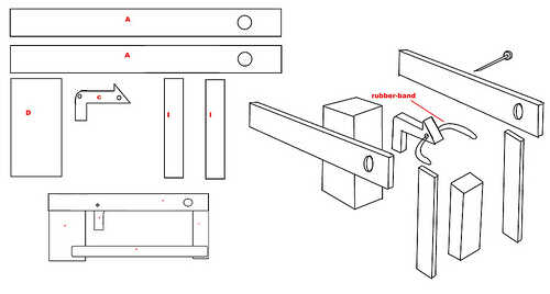 El componente siguiente es lo que hará a la empuñadura de pistola. Se coloca un orificio donde se inserta una varilla de pasador que conforman la porción de arco de la pistola. La espiga también pasará por la goma que es parte del gatillo, el gatillo vuelve a la posición correcta. La longitud de la pistola determinará cuánta fuerza los centavos se disparará con y determinan la longitud de la varilla que llegará a las monedas. La pistola era aproximadamente 10 pulgadas de largo. Si la longitud del cañón es demasiado corta, no será suficientemente largo se deslice hacia atrás el martillo que llegará a la moneda.