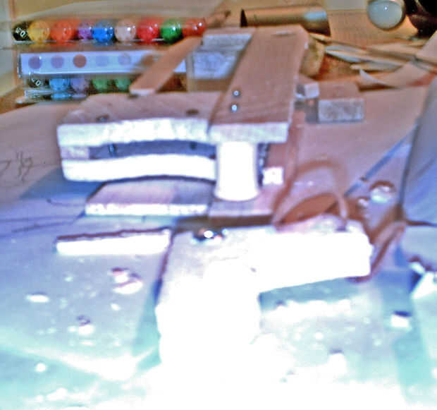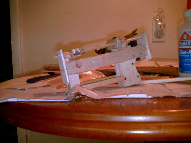Madera de balsa es muy débil y la fuerza de cuatro gomas pone una enorme cantidad de estrés en la madera que constituye el soporte de la pistola. Por lo tanto, utilicé palitos que se hacen de la madera más fuerte añadir soporte a las secciones más débiles de la pistola. Si se puede trabajar con otros tipos de madera
