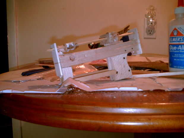 Una vez hecha la forma de la pistola, se unen la diapositiva con los pinchos de bambú. Para sujetar piezas juntas para pegar, con frecuencia envolver bandas de goma alrededor de las diferentes partes para mantenerlos juntos como se secan. Permite que las piezas a secar sin deslizarse. Es particularmente importante que la sección del pincho de bambú se pega en la pistola en la posición correcta, de lo contrario, la diapositiva no alcanzará en el gatillo o se atascará la diapositiva. Cuando pegar este componente, asegúrese de que la corredera se mueve fácilmente y golpea el gatillo en la posición correcta para capturar.