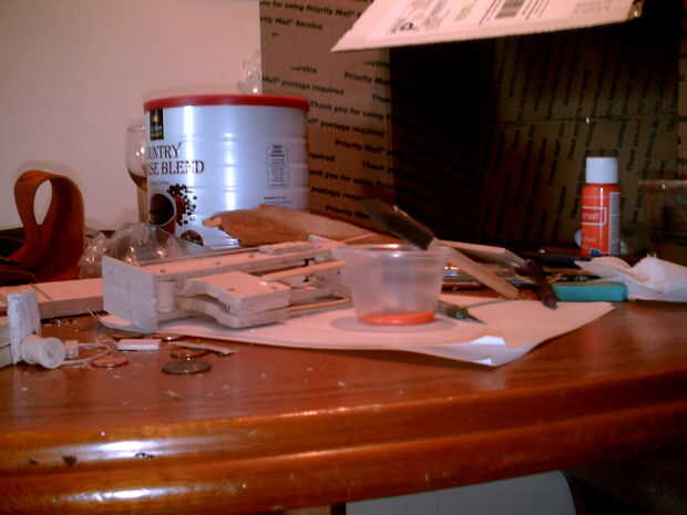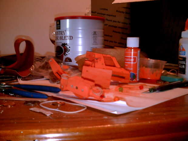 Puede ir con cinta adhesiva las partes juntas en un principio para asegurar que todo se encajan correctamente antes de pegar o clavar las piezas de la pistola juntos.
