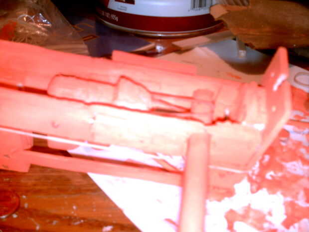 En este diseño de pistola, usé un palito de la clavija para formar el arco para esta pistola ballesta.  La palanca de espiga desempeña dos funciones adicionales.  Se utiliza para fijar la goma que trabaja el mecanismo del gatillo, y más tarde se utilizará como el eje apoyo para una torreta.  Las gomas que se tirón la corredera también se unirá a esta barra de pasador.
