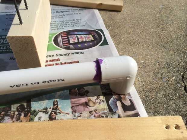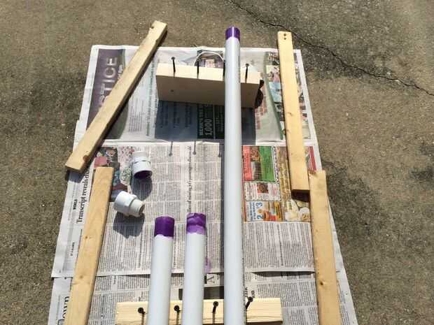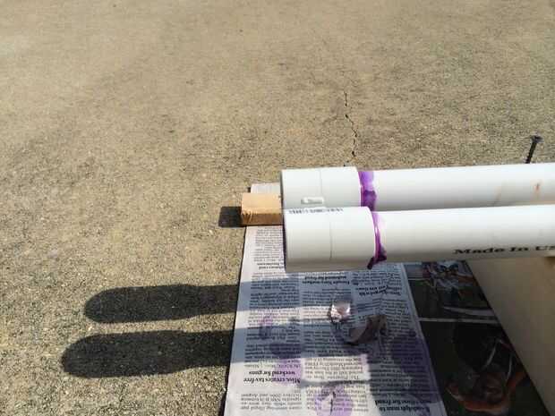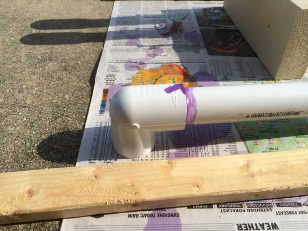 Cebe a cada extremo de las piernas y pieza de lona, así como los acoplamientos y codos. Cuando esté seco, pegarlos en el lugar. Pieza de lona obtiene un codo en cada extremo con el final no pegado se rosca. Cada pata tiene un acople en un extremo y un adaptador a rosca en el otro. Déjelo secar.