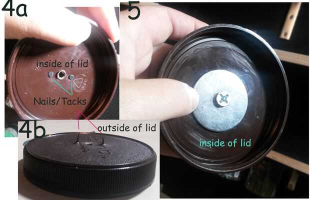 en la parte inferior de la plataforma. No sólo en el aire. Colocar la tapa para que la parte superior de la tapa está sentando donde usted lo desee en la parte inferior de la plataforma. Y Tack 2 clavitos o tachuelas a través de la tapa en la madera. Estos evitará la tapa girando como usted es atornillar encendido o apagado del contenedor