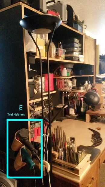 E = herramienta de fundas, para más herramientas de fácil acceso, como mi pistola y el taladro con cable