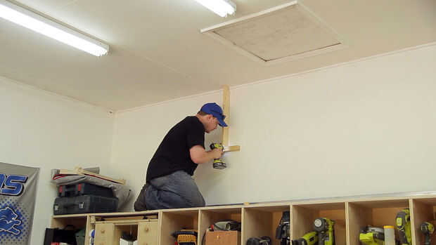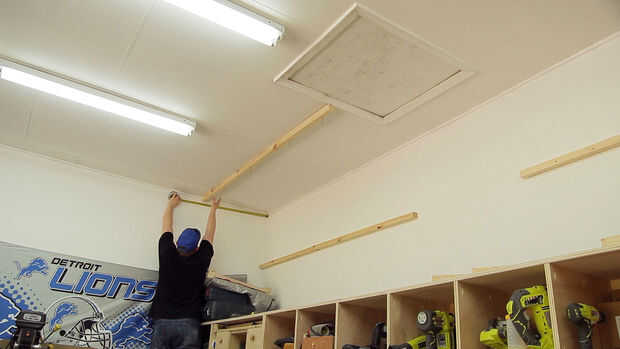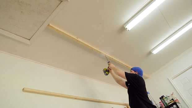 Mi techo vigas apuntan a la misma dirección como los estantes que estoy instalando y los tornillos que fueron utilizados para instalar los paneles de techo son claramente visibles. Esto hizo localizar una vigueta del techo super fácil para mí. Si las vigas de su techo están ejecutando perpendiculares a la dirección de sus estantes puede tienes que dedicar algún tiempo a averiguar donde están las vigas. Manejé tornillos de 3" a 10" aparte a medio camino a través del techo 2 x 2 mientras que todavía estaba en mi mesa de trabajo para hacer cosas un poco más fáciles mientras que él estaba por encima de mi cabeza. Cuando se instala en el techo con uno de los tornillos mediados asegure primero. Luego medir y hacer los ajustes necesarios para mantener el 2 x 2 paralela a la pared. Terminar conduciendo todo el techo tornillos de 2 x 2.