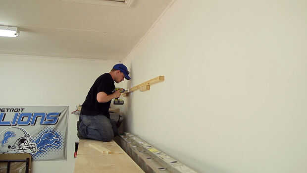 Para ayudar a posicionar la pared 2 x 2, exactamente donde necesita ser que corté un trozo de madera que podría utilizar contra el techo a una distancia constante desde el techo. Desde allí he instalado dos calas. Son piezas más de madera de desecho que celebrará la última Junta de 2 x 2 para facilitar la fijación. La Junta de 2 x 2 se coloca en las calas y asegurada con cubiertas de tornillos en cada pared en la pared de 3". Después se asegura las abrazaderas pueden eliminarse.