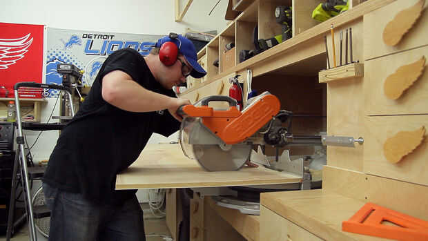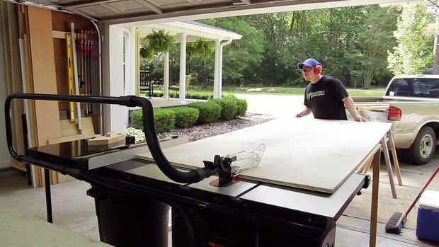 Utilicé madera contrachapada de 3/4" para mis estanterías. Estos paneles se pueden cortar fácilmente con una sierra circular pero tengo una tabla vio así que la usé. Tuve que recortar una de mis estanterías a medida así que usé mi sierra para cortar ingletes y había volteado el panel entre los cortes. Una vez más, una sierra circular barata que realizar la misma tarea. Previamente hice un conjunto idéntico de estantes en el lado opuesto de mi garaje sobre la puerta del garaje y utiliza 3/4 suelo de Advantech OSB que abarcó una distancia de 36" y todavía tengo que ver alguna flacidez en ella. Si sus estantes holgura con el tiempo es una solución super fácil para atornillar tableros de 2 x 2 en la parte inferior de los estantes les enderezar y dar rigidez a los estantes.