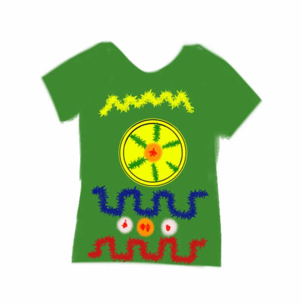 Pegar la tapa, tapas de botellas, piedras preciosas de plástico y limpiadores de pipa (doblarlas que les refrigerador!) en la camiseta con el pegamento caliente por lo que parece que hay controles por todas partes (no dude en tomar la fotografía como referencia).