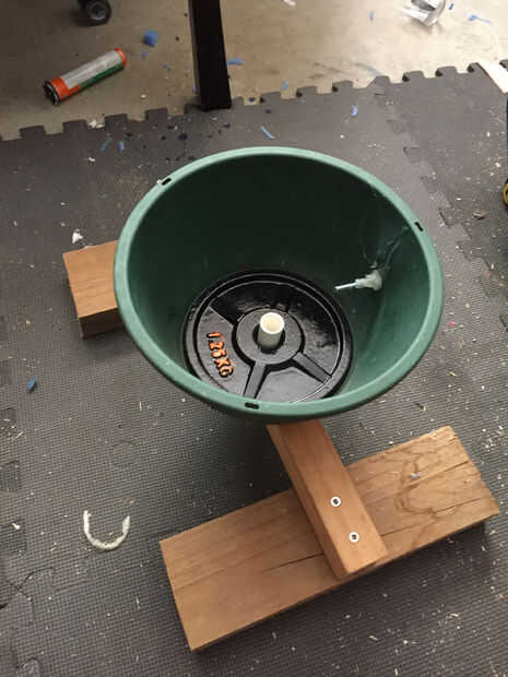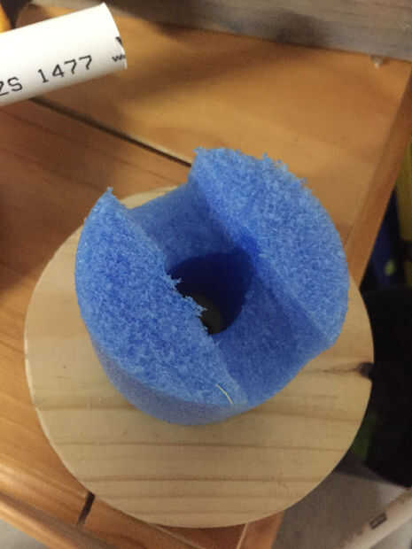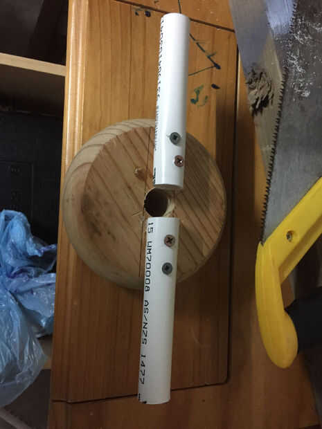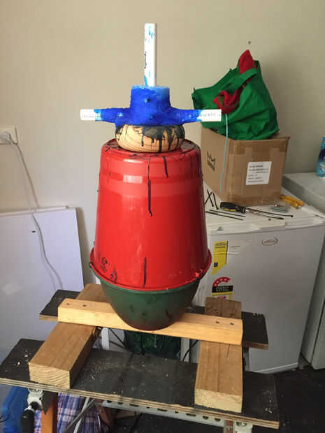 Os adjunto el cubo a la planta en maceta agujeros pequeños y ejecutando las bridas a través de ellos. Me perforó otro agujero en la parte superior y añade una pieza circular de madera a la parte superior con dos trozos de tubo de PVC perforado en modo pude atribuyo los brazos al cuerpo más adelante. Luego roscado de un tubo de PVC a través del cuerpo para mantener estable y añade un trozo pequeño de tallarines de la piscina en la parte superior como el comienzo del cuello.