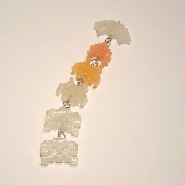 Uso saltar anillos para unir en filas verticales. Usé una posición de cada alien para una fila de encantos, la posición de la fila de encantos en el otro lado de los LEDs. Usé algunos pequeños tramos de cadena en la parte superior para asegurarse de que los filamentos fueron alineados. La orientación de los lazos de cada pieza determina la dirección que cuelga. Puede utilizar un poco de pegamento en el lugar donde los lazos y la pieza para mantenerla alineada.