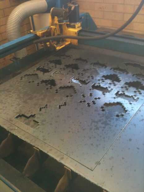 Los paneles fueron cortados de chapas de acero suave de 1,6 mm utilizando una máquina PlasmaCAM. El fichero CAD tuvo que ser importado en el programa PlasmaCAM y una corte de ruta programados para controlar el funcionamiento de la máquina.