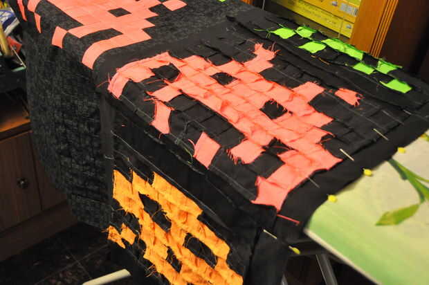 • Tome el bloque vacío negro y pin al invasor rosa, asegurándose de que te ponga los lados terminados en y al lado con todas las costuras hacia fuera.