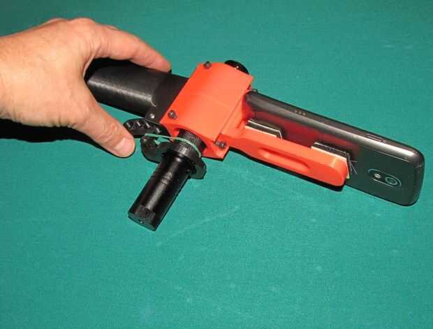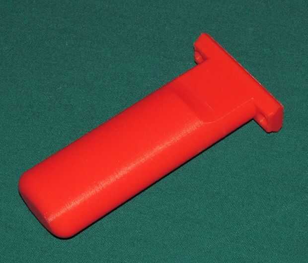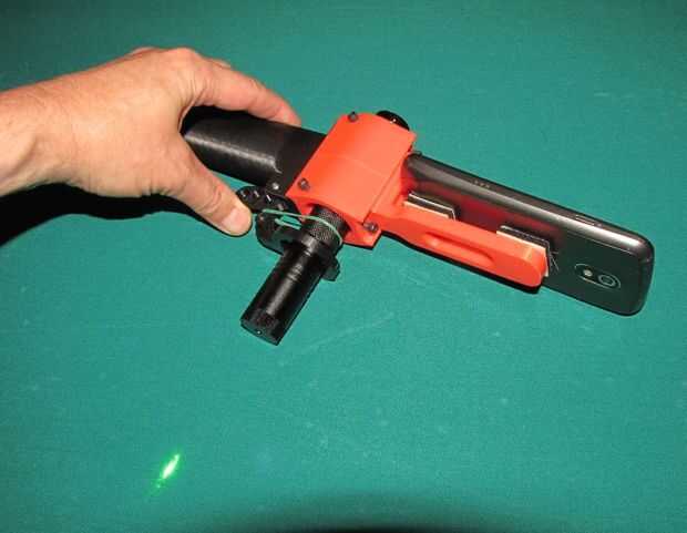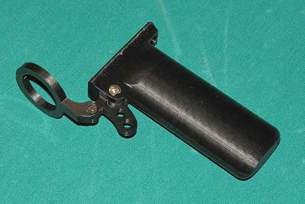 El mango se forma para caber comfortablemente en su mano y se desliza hacia el tubo del laser. El ajuste es apretado y seguro, pero he añadido un agujero de tornillo en caso de que usted no confía en él. La manija original fue sólo un mango y el sistema tuvo que ser funcionada con dos manos: uno en el mango y la otra para pulsar el botón en el láser. Había rediseñado con un gatillo para la operación con una sola mano.