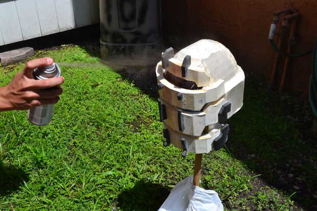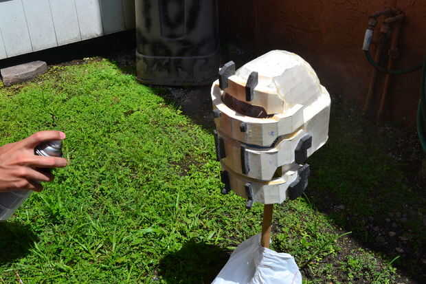 Ahora utilizar su primer pintura de aerosol y cubrir todo el casco para ver imperfecciones y también dejar seco y sello para un buen 5-8 minutos.