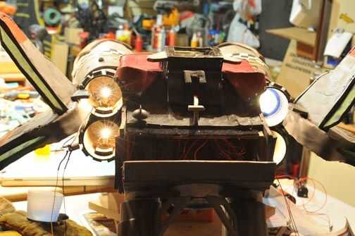Hay un sistema de 24 voltios (en conjunto) Encender todas las luces y el simulador que yu ver después. Soy un electricista terrible así que espero que ustedes chicos pueden subir con algo mejor. Todas las luces son 3,3 voltios funcione hacia fuera a baterías D de la fuente. Pega todas las tomas en su lugar y correr los cables a los interruptores ocultos (poner interruptores de eje de balancín bajo la espuma en la parte trasera justo en frente del cierre de velcro. Para las tapas del exhoust usé tazas de cerveza de plástico transparente y pintado de azul la parte inferior de ellos, se sientan hay perfecto. También se notó más motores he añadido a la parte de atrás como una ocurrencia tardía todos construido de espuma. También están capped con vasos de cerveza.