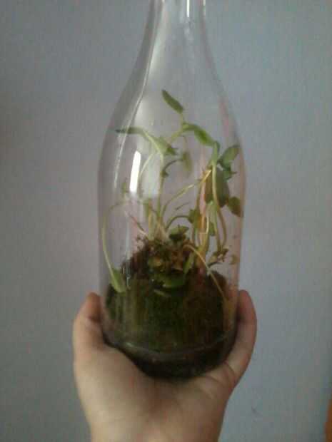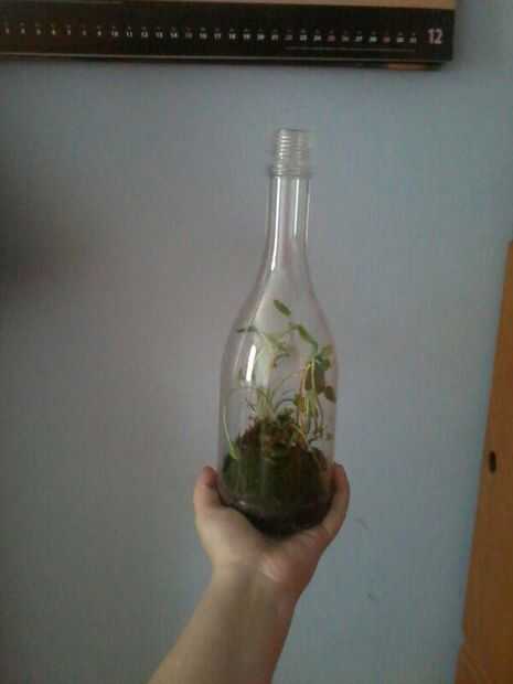 Algunas de mis plantas crecieron demasiado grandes para mi Orbe así que decidí plantarles. Para fin de año mi mejor amigo trajo una botella de champagne plástico llenada con dulces. (Como éste: http://www.amazon.com/Mars-Chocolate-Celebrations-Bottle-Pack/dp/B0167IMXQ2/ref=sr_1_1?ie=UTF8&qid=1451658486&sr=8-1&keywords=celebrations+bottle)