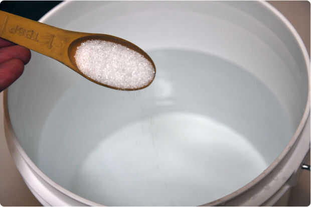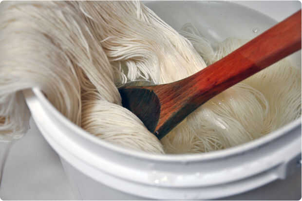 Llene la bañera de cubeta o plato con agua caliente del grifo, una o dos gotas de Synthrapol y ácido cítrico y el vinagre. 1 cucharadas de ácido cítrico por cuarto de galón de agua de uso o si usas vinagre uso agua 50/50 de vinagre en el baño como el vinagre es más diluido. (Ex: 1 taza agua 1 taza de vinagre) Baje la madeja en el agua por uno de los lazos y suavemente empújelo hacia abajo bajo el agua con la cuchara grande. Remojar por lo menos 1 hora, pero durante la noche es ideal, especialmente para las más finas fibras como la alpaca y la seda. Desea que las fibras para ser completamente empapado.