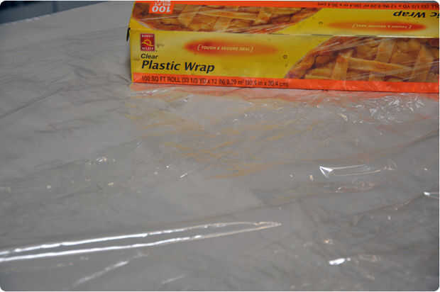 Cubrir su espacio de trabajo con el abrigo plástico; Asegúrese de que se superponen unos pedazos como vas a envolver el hilo en ella y no desea que el tinte que se escapa hacia fuera. Colocar el hilo en la envoltura de plástico.