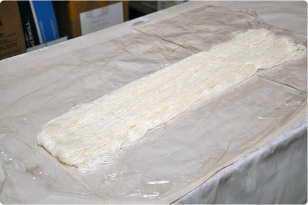 Utilice el hilandero de la ensalada o la secadora gire hacia fuera el agua de remojo de exceso hasta que el hilo esté sólo húmedo al tacto.