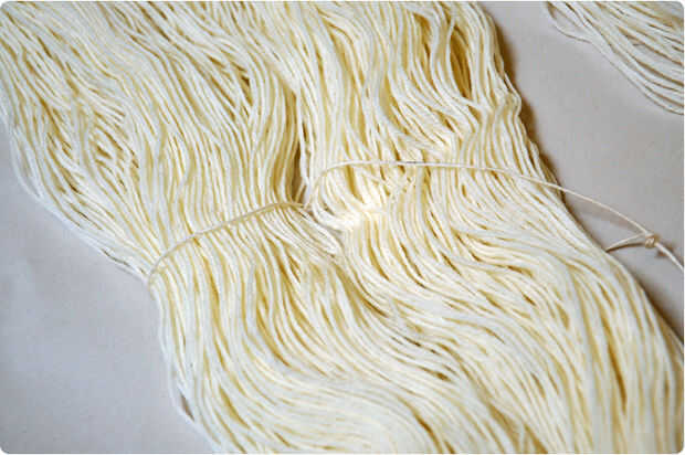 Usando el hilo de algodón, atar la madeja libremente en algunos lugares más; desea por lo menos 4 lazos alrededor de la madeja para ayudar a mantener organizada y desenredado.
