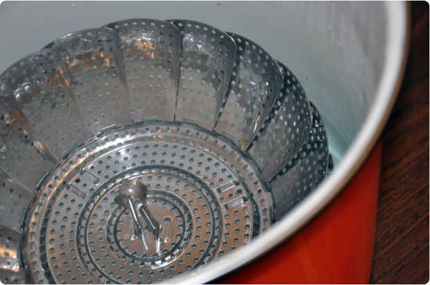 En su olla al vapor, poner un par de pulgadas de agua y la cesta para cocinar. Asegúrese de que el vapor se va a celebrar el hilado/itinerantes fuera del agua. Calentar hasta hervir en alto y luego bajar el calor. No quieres hacerlo hervir lejos demasiado rápidamente, pero necesita un montón de vapor.