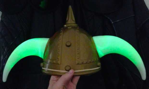 Para el casco original de metal pesado, simplemente enrollé EL cable alrededor de los cuernos en espirales. Oculta la batería por enrollado en el cuello que cubre que el casco tenía.