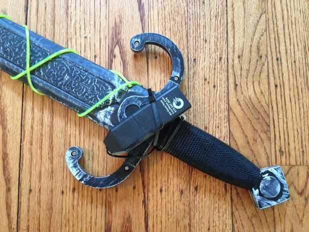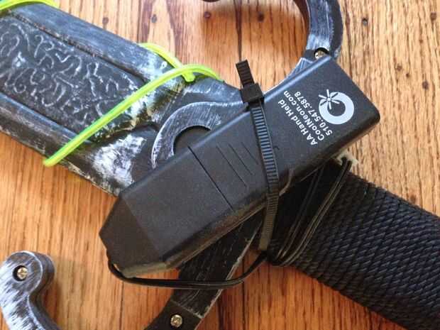 Espiral el otro EL alambre alrededor de la espada y asegurar la batería en la parte de protector de la empuñadura. He utilizado un ziptie negro asi se mezcla bien en.