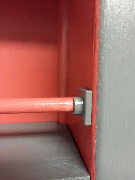 La varilla de pasador titulares fueron puestos por la medida de los estantes de nivel la misma distancia en ambos lados de la despensa, esto me dio un buen carril nivel para mantener las cosas en su lugar. Algunas de la barandilla de la espiga es necesario algún recorte, ya que eran demasiado largos, pero después algunos retoque pintura ponerlos en su lugar.