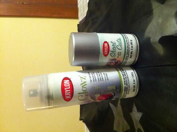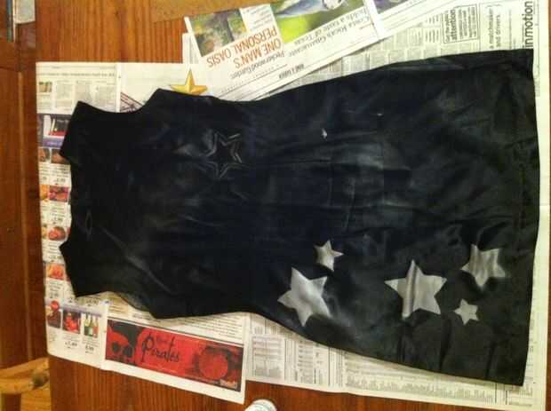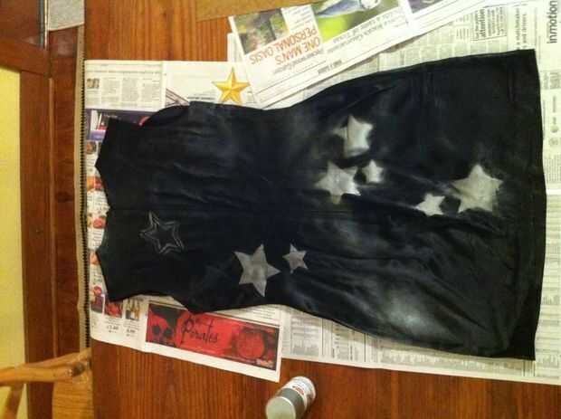 4. una vez que termine la primera cara, retire el periódico de encima del vestido y la plantilla. Tome el metálico o resplandor (preferencia personal aquí) y sostenga sobre un pie sobre el vestido. Ahora, rocíe una línea continua, vaga en el vestido entero. Se supone que como un grupo suelto de estrellas - como la vía Láctea. No tiene que ser perfecto o aseado en todo.