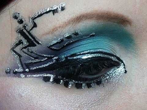 Luego viene la parte difícil. También es bastante variable, por lo que no se preocupe si su diseño no es exactamente como el de la foto. Línea de los ojos (superior e inferior). Copie el diseño lo más cerca posible al igual que en la foto con el delineador líquido negro. Si usted tiene revestimiento de plata, muy bien! Si no (no), usted puede esperar a que el trazador de líneas seco y acento con sombra de ojos blanca o plata.