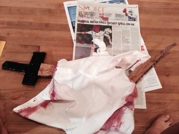 Mitad de palo los dos piezas de la espada en la camisa. Uno en la parte delantera y uno en la parte trasera Asegúrese de que se parece a su apuñalado en ti. Pegamento caliente funciona mejor.