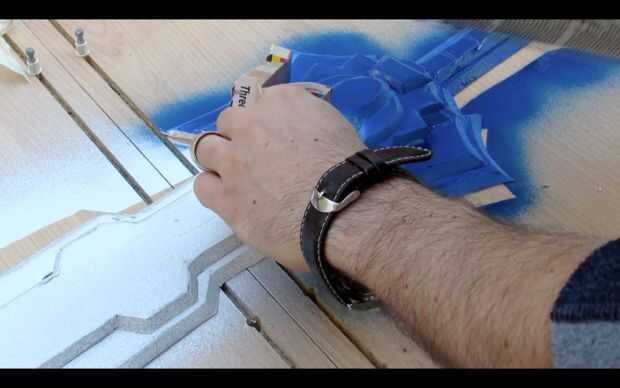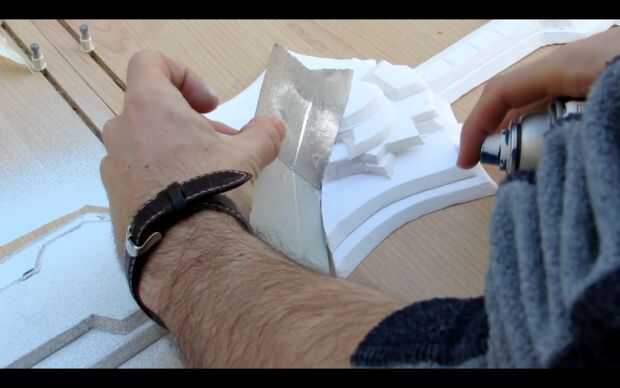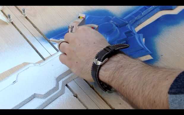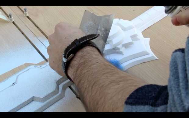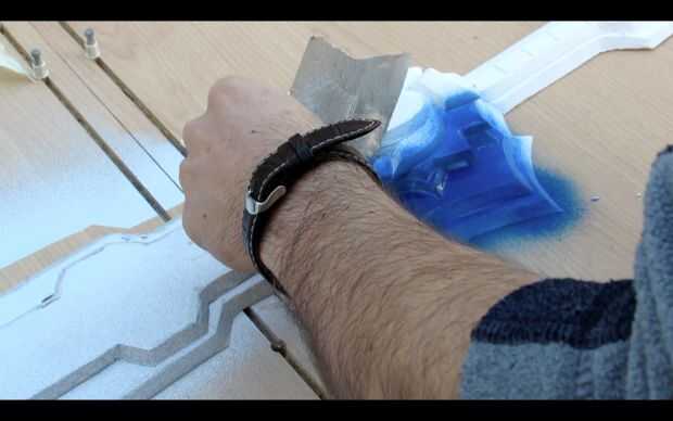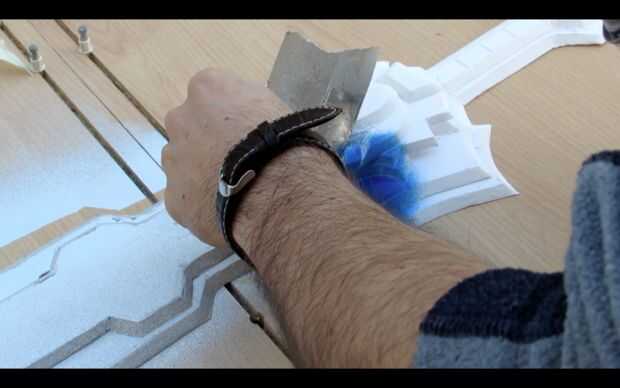 Repita para las piezas en la otra mitad de la espada. Usted puede volver a utilizar las máscaras de cartulina como todo se refleja, por lo que las piezas son del mismo tamaño!