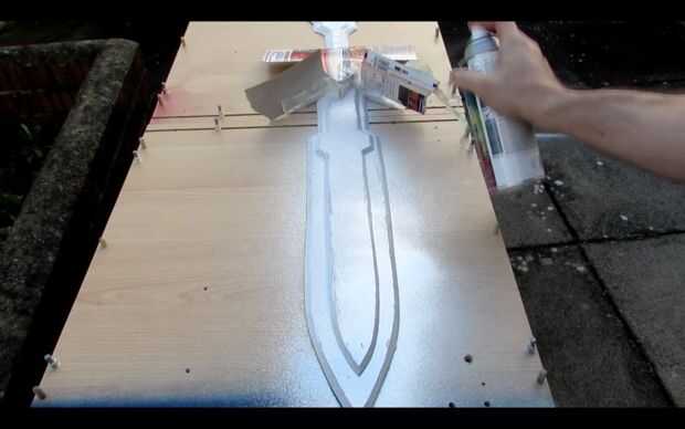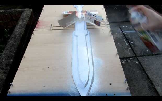 Sosteniendo sus máscaras de tarjeta en su lugar, rocíe la empuñadura y el pomo de la espada.