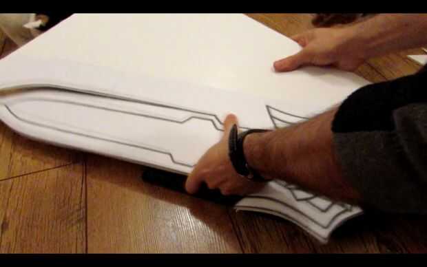 A continuación, aproximadamente recortar la plantilla de espada y pegamento en el espacio en blanco de la plantilla de espada, presionando la plantilla de la espada sobre una hoja de tablero de la espuma de esquina a esquina diagonalmente.