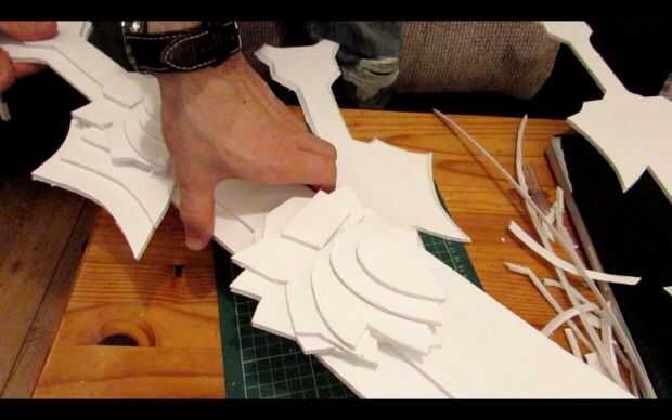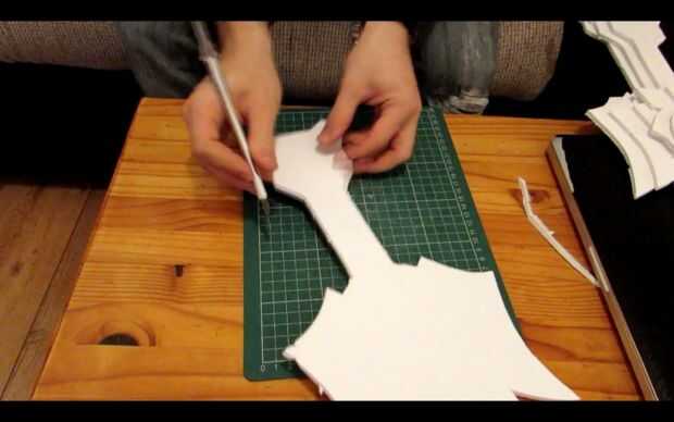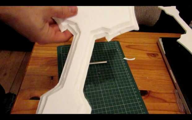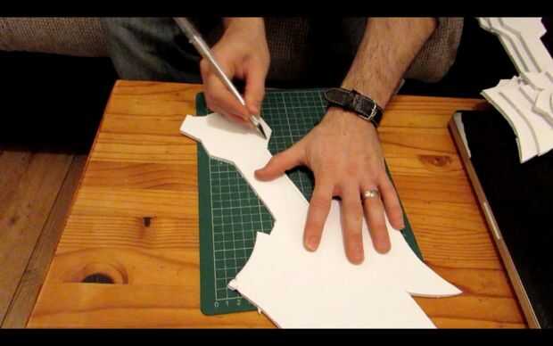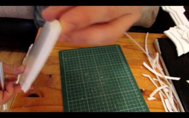 Usando el cuchillo usted, ángulo de la hoja para que se sienta a 45 grados a lo largo de un borde. Usted puede comprar espuma de 45 grados cortadores de tablero, pero he encontrado que una mano firme y práctica en las piezas de repuesto de espuma tablero (curvas y rectas con bordes) era lo suficientemente bueno para mí.