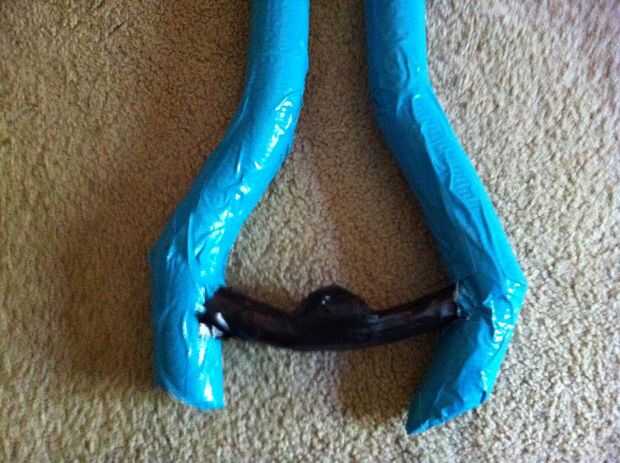 tomar el aislamiento de la pipa y empezar a empujar hacia abajo en el tubo hasta que alcance unos 2" más allá de la manija. hacerlo detrás del ángulo corta de la ecxess de la espuma en un ángulo y gire alrededor de cinta nuevo en. hacerlo con ambas hojas. Si desea ayuda adicional, coloque un pedazo pequeño de plpi entre la tubería y cinta hacia abajo.