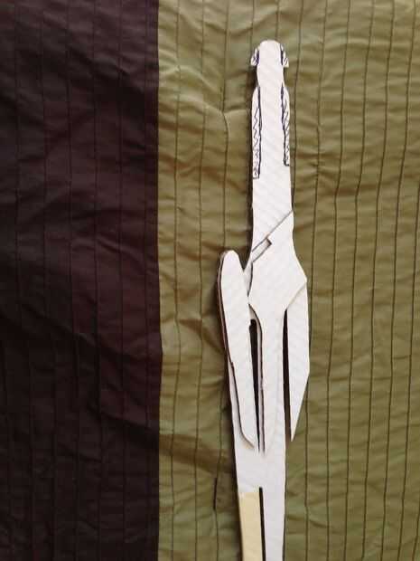 Su espada tiene una forma muy única a él. Encontró algunas ilustraciones, impresas en una película de transparencia y proyecta en la pared donde había grabado un pedazo de cartón y remontar la imagen en la cartulina después de había ajustado la imagen al tamaño deseado - unos 2'.