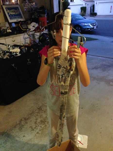 Entonces que papel maché tenía la lámina de la espada usando una combinación de periódico y una mezcla 50/50 de agua y pegamento de Elmer. Mi hija y yo aplicar 2 capas de papel maché.
