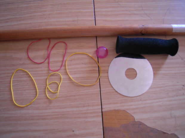 Artículos necesitas: 1 palo de escoba madera; 1 disco duro (tienes que desmontar un viejo y recoger un solo disco); 1 perilla de espuma de manillar de la bicicleta; 1 ensaladera robado de cocina de Barbie; algunas bandas de goma.
