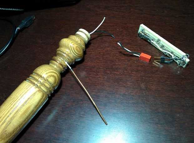 La empuñadura era de una antigua barandilla de cuna. Un agujero de 1/4" fue perforado por el centro y los agujeros pequeños fueron perforados lateralmente. Positivos y negativos de los cables a través de estos agujeros y conecte a la barra de luces con conectores molex. Alambre sólido de cobre se envuelve alrededor de la manija para hacer un anillo conductor. Esto es lo que hace contacto con la fuente de alimentación cuando se coloca en su soporte.