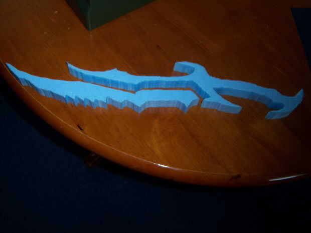 Ahora las plantillas están listas usted puede cortar alrededor de la espuma. corte alrededor de la espada entera primero y luego separar la hoja del mango (se muestra en las fotos). Ahora usted debe tomar un poco del espesor de la hoja. Me quité la alrededor de 10mm pero su arriba a usted cuánto (no es un verdadero límite o importe).