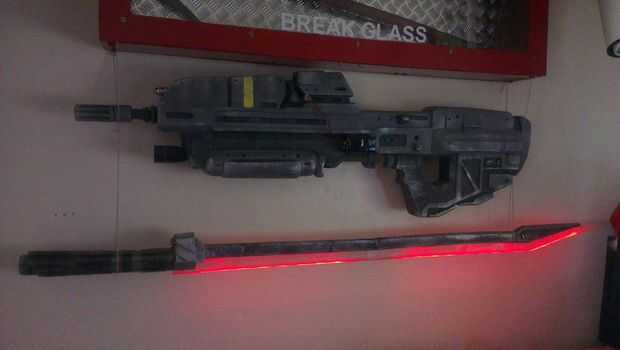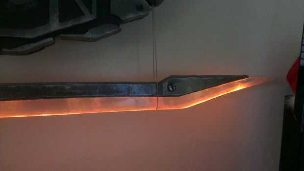 De cero espada utiliza un color cian, logrado establecer el verde y el azul al 100%. Construí esta espada para acompañar un traje de Deathstroke futuro, así que orange podría realizarse utilizando 100% rojo y verde 50%. Es genial ser capaz de cambiar el color a casi cualquier combinación, aunque siendo realistas el potenciómetro pequeño tamaño y efectividad limita cada canal de color apagado, 50% y 100%, lo que combinaciones de colores 26 (o todos).