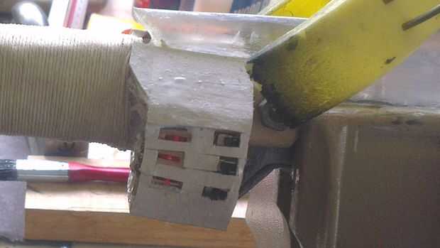 Cortar secciones de madera (pino es fácil de trabajar: tenía algunos pedazos de desecho de entarimado para trabajar con) para formar una cubierta de los interruptores. Pegamento caliente es útil para mantener temporalmente los interruptores como se sujete al madera, pero parte 2 epoxi rápido proporciona una base más segura y es lo mejor para la Unión de varias secciones de la madera (pegamento de madera es demasiado débil y lento para costuras estrechas).
