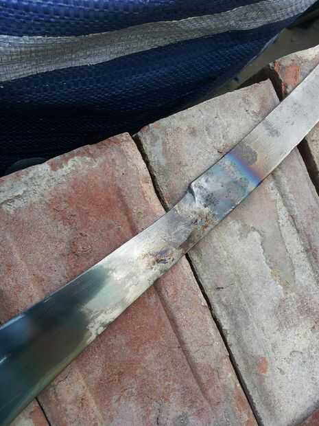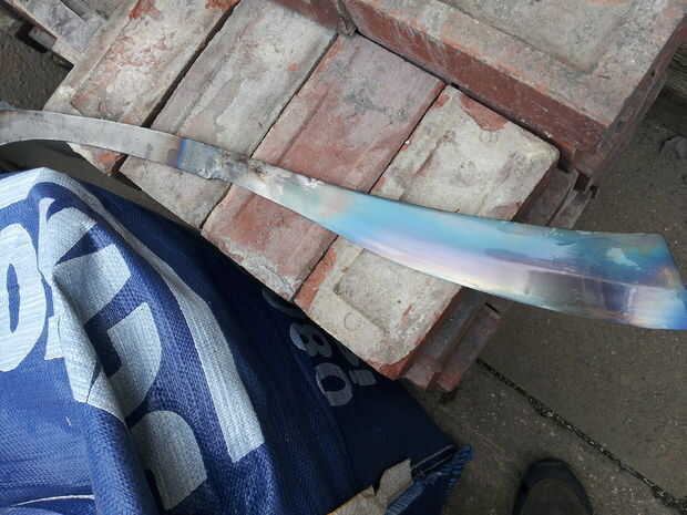Apaga en el agua y lo dejamos una hora antes de hornear en el horno durante otra hora aproximadamente 270 c, con el objetivo de un color morado. Dependiendo el color depende de cómo suave el acero va a ser, una búsqueda rápida en Google rápidamente encontrará un gráfico de colores acero contra las temperaturas, y mi investigación indica que un hacha debe ser templado a un color púrpura, y puesto que mi herramienta no encaja realmente en ninguna categoría, me pareció un hacha probablemente una buena dureza para tenerlo ya que se ha diseñado con cortar leña en mente. Claramente fui demasiado lejos y la hoja fue azul, lo que significa es demasiado suave. Pude han comenzado encima de la fase de amortiguamiento pero pues honestamente sólo voy a usar la espada para la exhibición, estaba perfectamente contento con tener un poco en el lado suave.