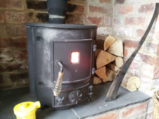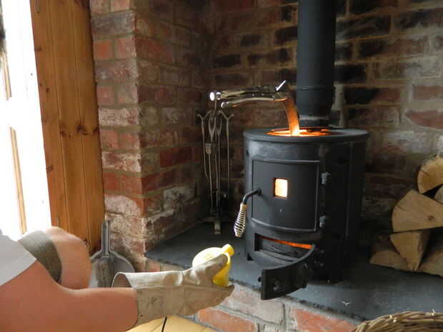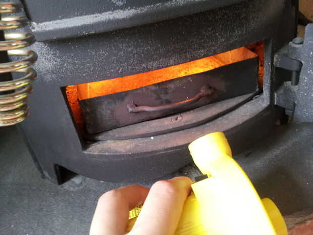 Necesitaba una fragua para mantener el calor en el acero, así que acabé utilizando nuestra estufa de leña. Esto fue, por supuesto, una idea tonta y era muy asustadizo. Bien te aconsejo que construir una fragua adecuada y hacerlo fuera, sin embargo, estoy poniendo las fotos hacia arriba porque el principio básico es el mismo para cualquier fragua (aparte de fraguas de gas). Es sólo un fuego bien aislado con buena circulación de aire. Utilicé un inflater de la cama de aire para ventilación y puso la espada en a través del orificio en la parte superior. Claramente, la estufa no fue significada para esto y en este punto comenzó a brillar intensamente rojo.