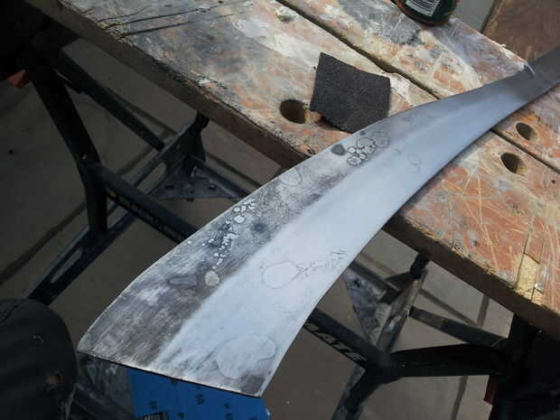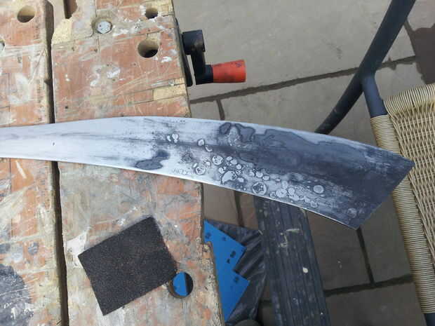 Después de terminar con la lijadora orbital y lija de grano bajo, su forma de trabajo aún más a través de los granos (eventualmente tendrás que pasar a papel de lija regular puesto que lija es difícil conseguir en granos de altos). Alterno la dirección de su lijado como trabajar a través de los granos, finalmente acabando con el grano más alto puede hacerse en agua jabonosa caliente. Si todo ha ido a plan de la hoja debe brillante en este momento. Ahora usted puede poner un borde adecuado en él mediante un archivo. Lo convierten en unos 25 grados, aunque si sabes su acero es demasiado suave o demasiado quebradizo entonces puede que desee un mayor ángulo para que la retención del borde es mejor. Totalmente no afilar pero sin embargo, esa parte debe ser la última cosa que hacer.