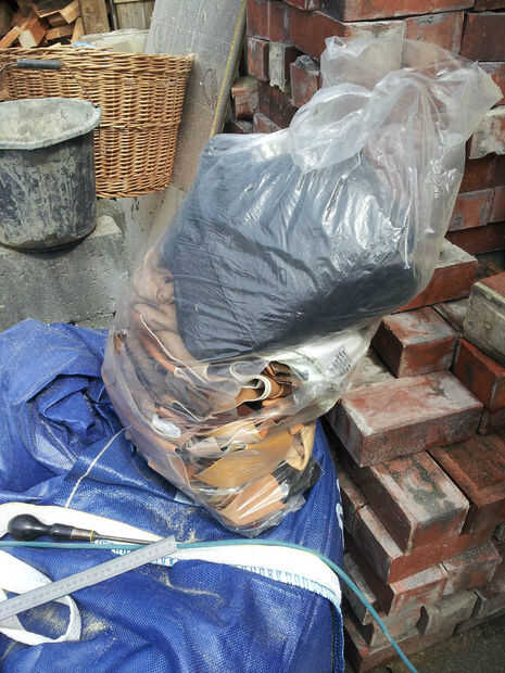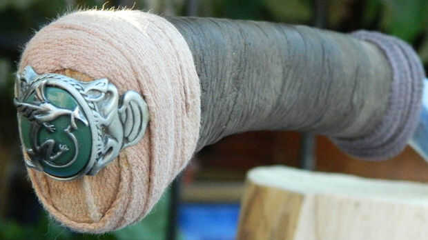 Sacó de mi bolso grande de cuero de 40 año de edad y buscó algunas piezas que adapta el estilo que quería ir con. Terminé yendo por una pieza de aspecto natural y agreste. Desde allí se trataba simplemente de cortar en una tira fina y enrollándola alrededor fijándola con pasadores en el panel en los extremos. Al principio parecía bastante feo como el cuero no era ajustado contra la manija, así que para corregir esto corté la tira por la mitad y envuelto con dos tiras más finas que una gruesa. Yo envuelto en los dos extremos con un cordón como un toque decorativo y también como una manera de sentir donde el mango de las transiciones hacia la hoja para no cortarse. También encontró un anillo y al final como una piedra con arcos de tipo. La cadena se sostiene más o menos juntos, pero usé algunos stick evo sólo para asegurarse.