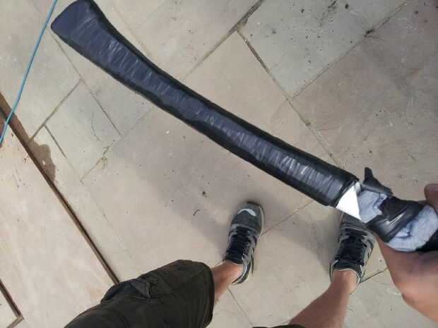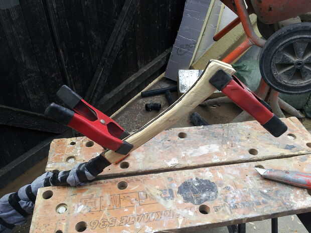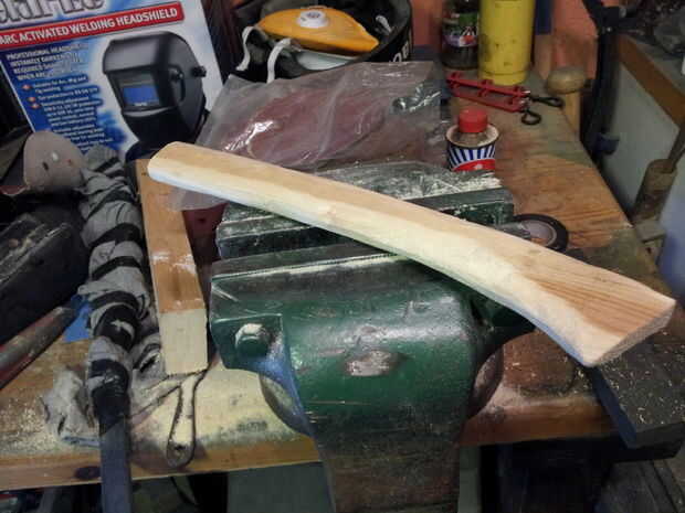 Así que esta es la parte donde el trabajo duro paga y llegar a pasar un poco de tiempo está un poco más artística y creativa. Hice un mango hay que reconocer que bastante crudo de alguna leña de pino tenía por ahí y asegurado con evo-palo y alguna cinta aislante. Decidí que quería un abrigo de cuero con una leve especie tropical de mirada.